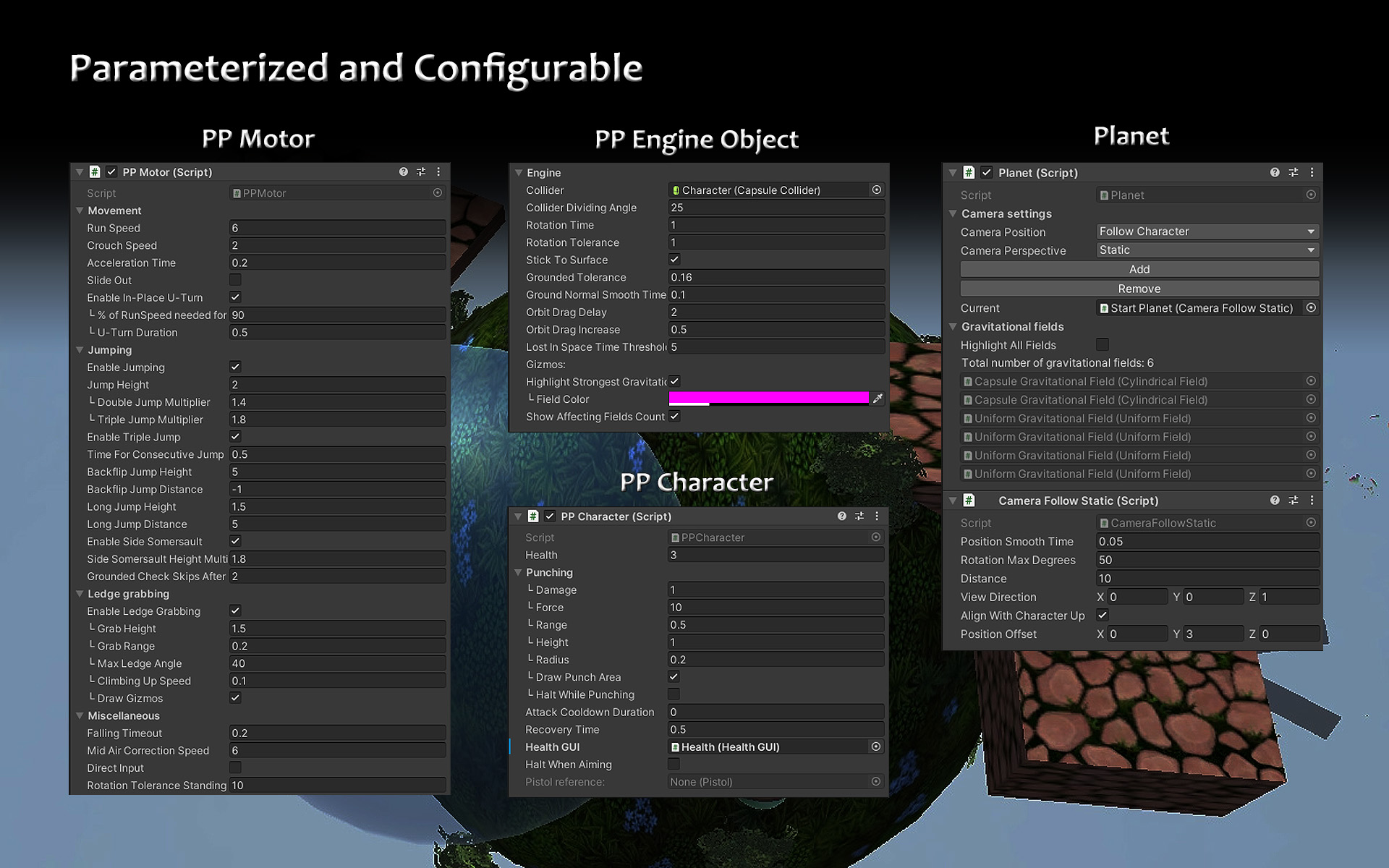 This asset tries to replicate the character controller of Super Mario Galaxy. It therefore implements an own physics engine for travelling between planet and platforms.