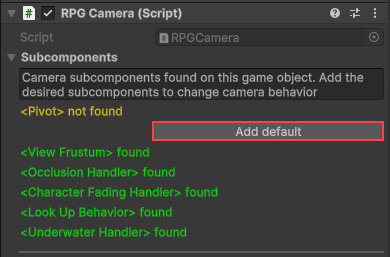 - RPGCamera: This script contains all general camera functionality like yaw, pitch or zoom. Additional functionality is based on the subcomponents you add to the game object – either manually or by adding a default via button (see screenshot below).