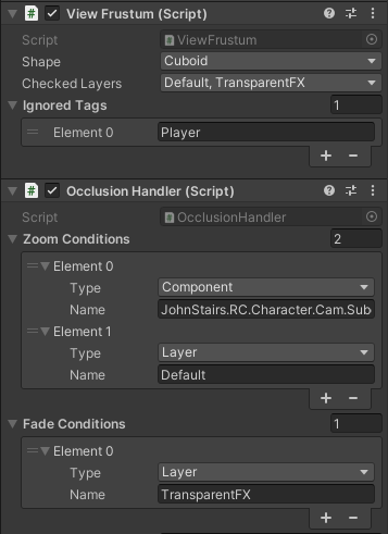 The Occlusion Handler describes how game objects inside the View Frustum are processed, i.e. if they force the camera to zoom in or if they should be faded out. Objects that are considered by the View Frustum but do not fulfill any of the conditions are not causing anything.