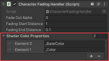 This asset is written based on URP. However, other pipelines and custom shaders are also supported. Every camera subcomponent that deals with the fading of objects has a list of shader color properties:
