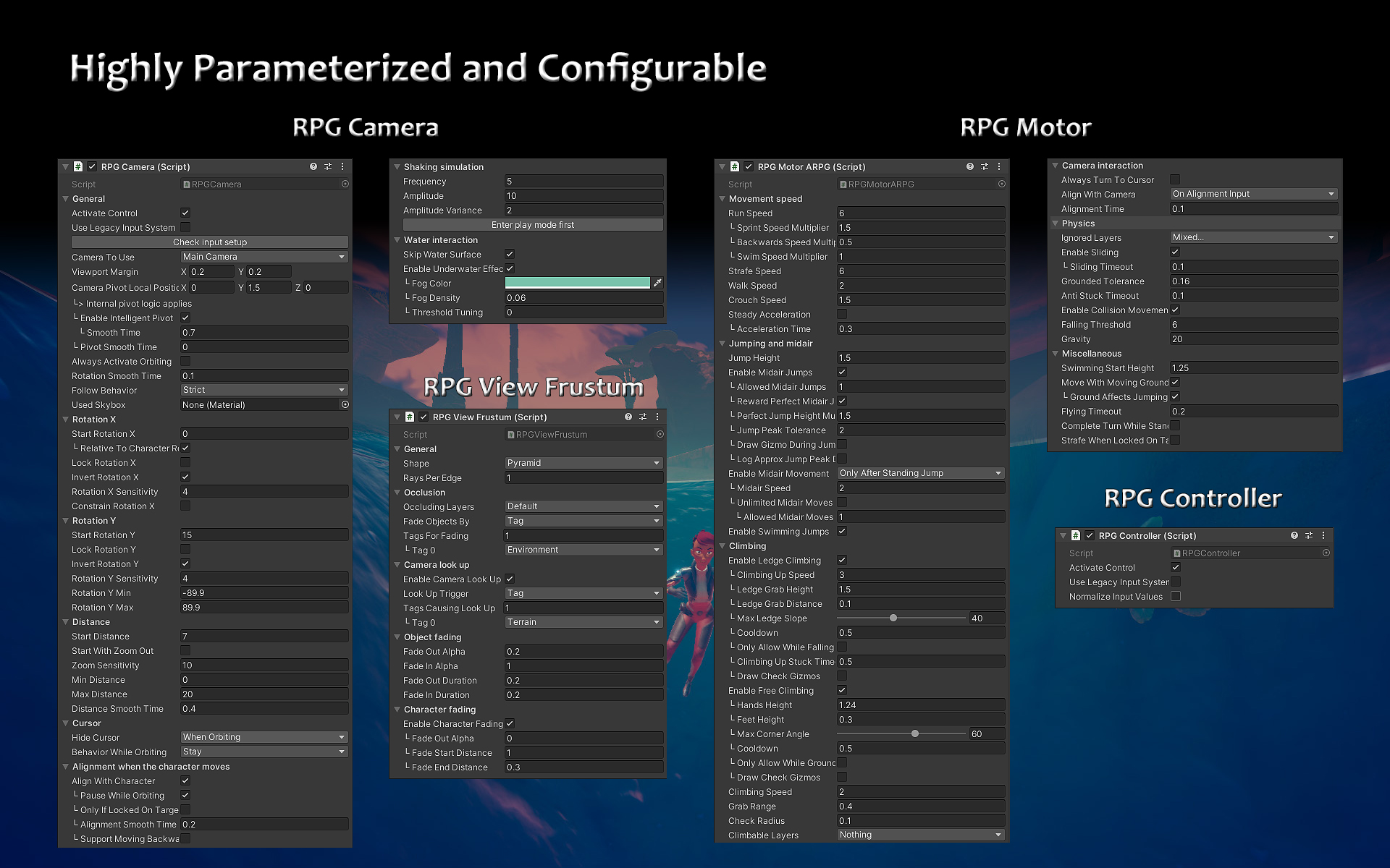 This asset contains separate RPG camera and character controllers for MMO or Action RPGs. It is greatly inspired by famous MMO and ARPG games, like World of Warcraft or Zelda BotW.